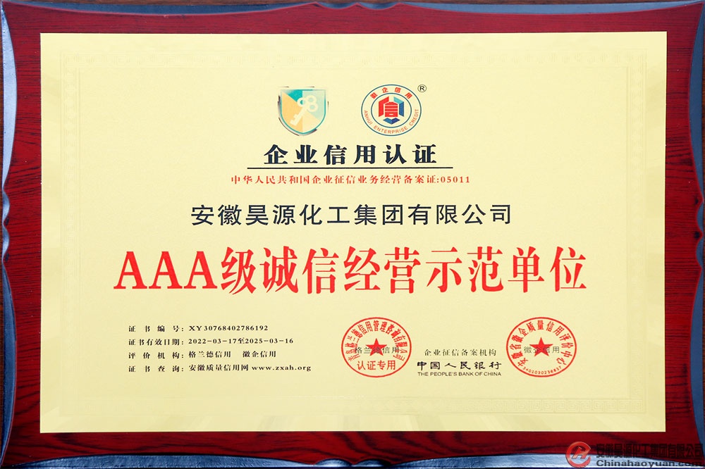 安徽省徽企質(zhì)量信用評價中心依據(jù)GB/T23791-2009《企業(yè)質(zhì)量信用等級劃分通則》,通過基本信息、政府監(jiān)管、媒體信息、企業(yè)資質(zhì)、質(zhì)量檢查、法院判決、知識產(chǎn)權(quán)、社會責(zé)任、企業(yè)運營等信用信息,進行客觀獨立的集成、分析和評定。針對公司的信用記錄,經(jīng)營狀況、財務(wù)指標(biāo)、發(fā)展前景,結(jié)合國家及地方相關(guān)政策,本著公平、公正、獨立、客觀、科學(xué)原則,評定安徽昊源化工集團有限公司為AAA級誠信經(jīng)營示范單位,并為公司頒發(fā)了牌匾及證書。