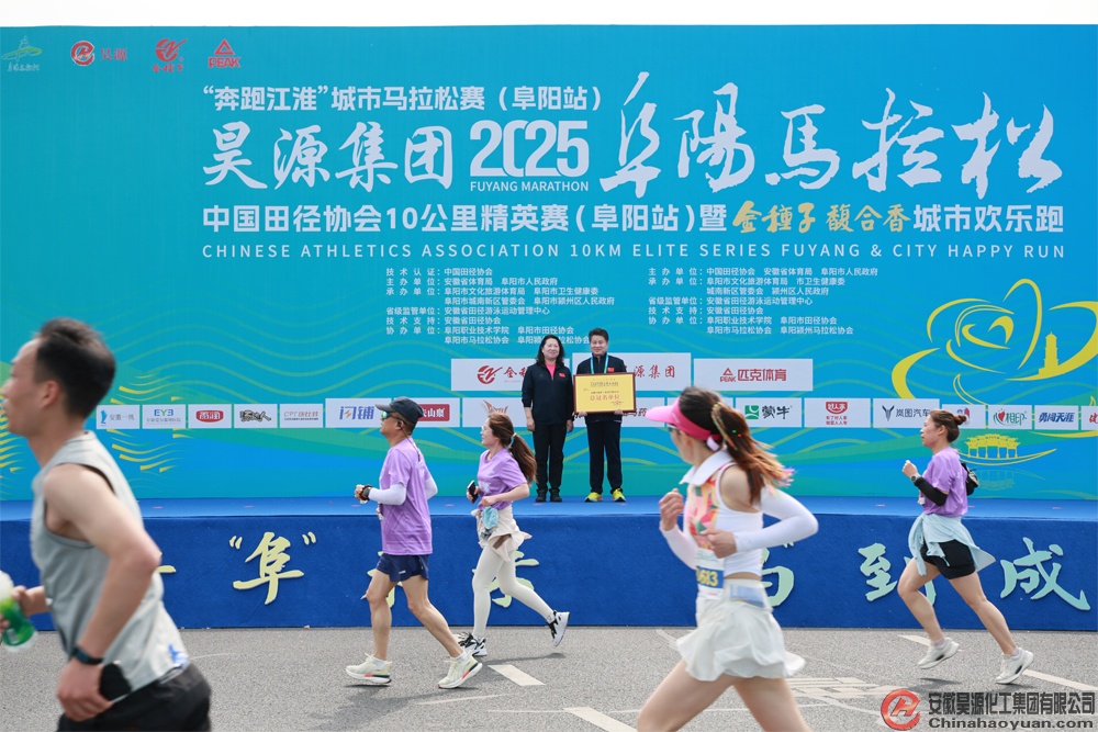 在企業(yè)授牌環(huán)節(jié),市領(lǐng)導(dǎo)代表昊源集團(tuán)2025阜陽(yáng)馬拉松官方授予安徽昊源化工集團(tuán)有限公司總冠名單位獎(jiǎng)牌。