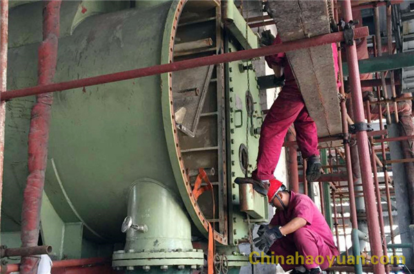 6月14日,氣溫偏高,但是為了保證生產(chǎn)穩(wěn)定性,凈化車間部分操作工和維修工在管理人員的帶領(lǐng)下頂著烈日、加班趕點(diǎn),對(duì)一期合成機(jī)組凝汽器進(jìn)行檢修。